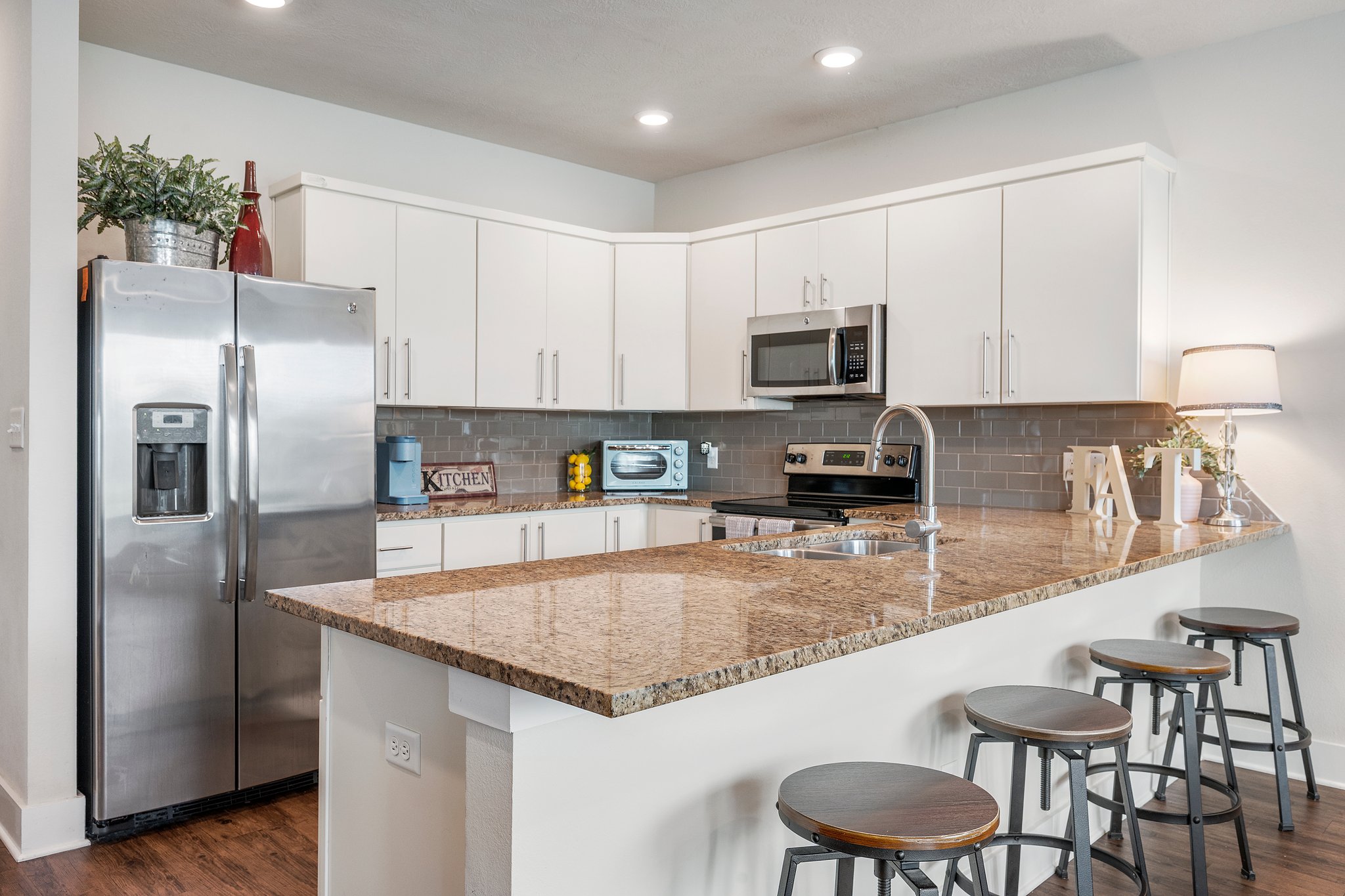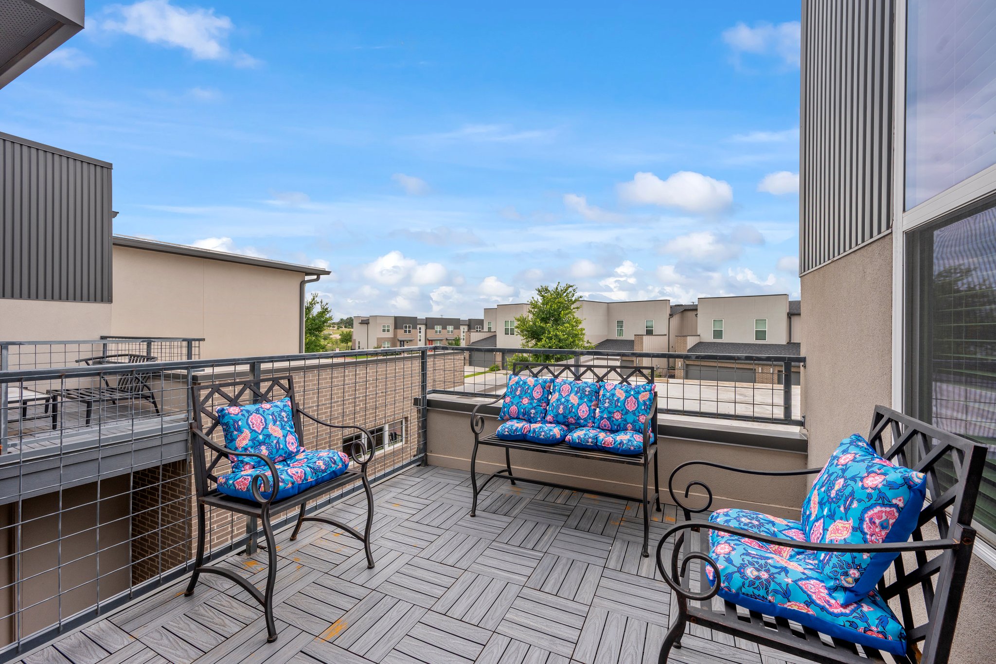 Urban style meets southern charm! This sleek and stylish home delivers a unique blend of modern design and everyday comfort — right in the heart of South College Station. Offering a cool city vibe with clean lines, thoughtful upgrades, and a layout intended for real life. Downstairs, you’ll love the wide-open living space — perfect for hosting or hanging out — plus a bonus study area off the hallway that makes a great home office or creative corner. The kitchen impresses with a stunning wraparound granite countertop, contemporary cabinetry, and plenty of prep space. Upstairs, you'll find three very spacious, light-filled bedrooms, including a dramatic primary suite with soaring ceilings and a luxurious feel. Step outside to your private upstairs terrace and soak in some fresh Texas air, which is only available with a few units! Upgrades throughout include wood vinyl flooring, tile surround in baths, wired for security system and plush carpet upstairs. Also, enjoy garage parking! But the perks don’t stop at the door — the neighborhood offers a fenced-in dog park, scenic walking trails around a pond with a tranquil water feature, and a covered, expensive patio area with built-in BBQ and seating — ideal for weekend gatherings. Just minutes to Highway 6 and all the new and exciting amenities of South College Station, this home offers style, space, and location -- all wrapped into one standout package!